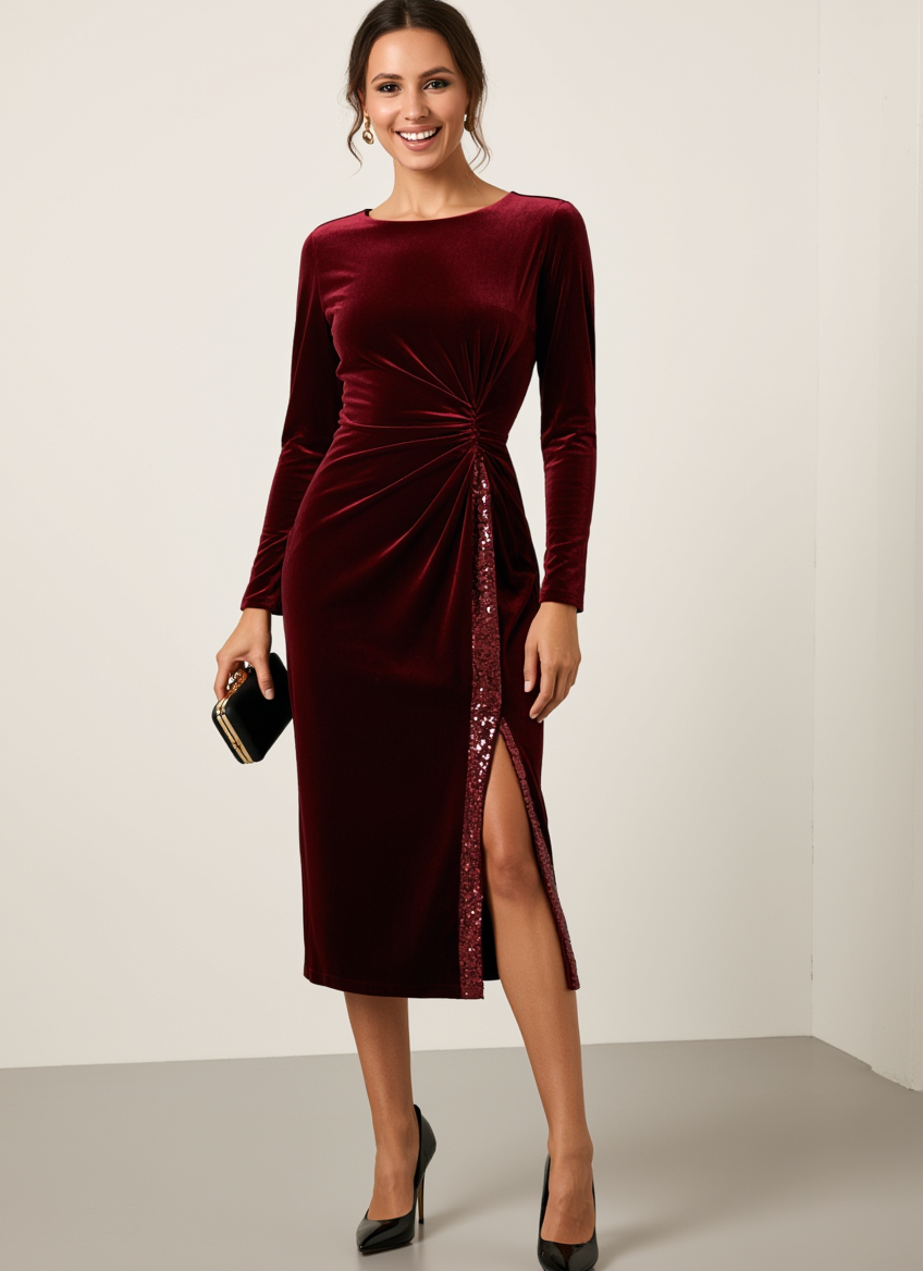 Rochia Adnana, confectionata din catifea si paiete, este potrivita pentru evenimentele de seara, cina sau cocktail-uri. Lungimea rochiei este midi, de 110 cm. Catifeaua este moale, cu textura pufoasa. Rochia se remarca prin drapajul lateral cat si prin detaliul cu paiete in zona slitului frontal.
